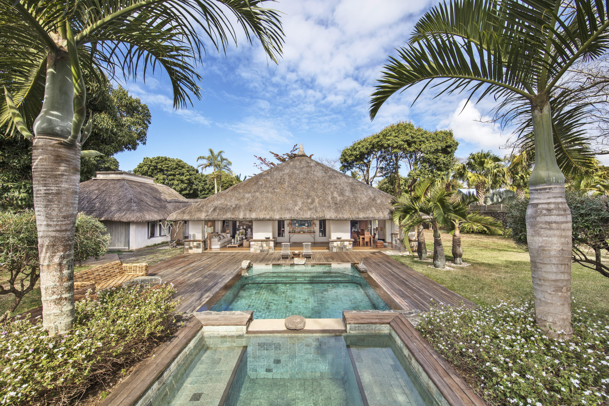 Style épuré, volumes en hauteur et larges débords de toiture pour la fraîcheur, lumière et cours intérieures offrant perspectives et accès sur le jardin, sont les matières premières de cette maison.
